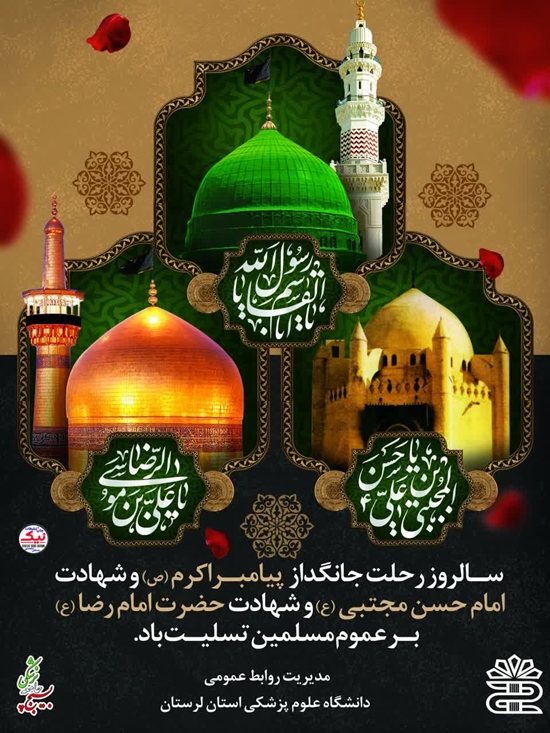 رحلت جانسوز رسول گرامی اسلام  حضرت محمد مصطفی (ص) ، شهادت امام  حسن مجتبی(ع) و شهادت امام رضا (ع) بر عموم مسلمین جهان تسلیت و تعزیت باد.