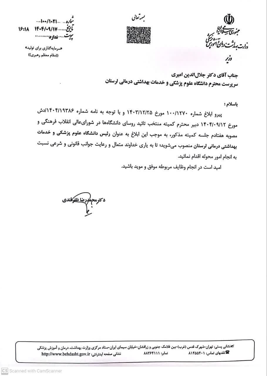 پیرو ابلاغ شماره ۱۰۰/۱۲۷۰ مورخ ۱۴۰۳/۱۲/۲۵ و با توجه به نامه شماره ۱۴۰۴/۱۹۳۸۶/دش مورخ ۱۴۰۴/۰۹/۱۲ دبیر محترم کمیته منتخب تائید روسای دانشگاه ها در شورای عالی انقلاب فرهنگی و مصوبه هفتادم جلسه کمیته مذکور به موجب این ابلاغ به عنوان رئیس دانشگاه علوم پزشکی و خدمات بهداشتی درمانی لرستان منصوب میشوید تا به یاری خداوند متعال و رعایت جوانب قانونی و شرعی نسبت به انجام امور محوله اقدام نمائید.