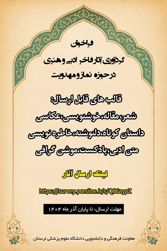 شیوه ی ارسال آثار: ➖مقاله: با فونت Nazanin ، سایز 14 ، شامل عنوان و چکیده و متن 5000 تا 8000 واژه ای ➖فیلم/ کلیپ: حداکثر 3 دقیقه، افقی ➖عکس: کیفیت 300 dpi ، حجم حداکثر 50 مگابایت ➖شعر: کلاسیک یا نو، مرتبط با موضوع