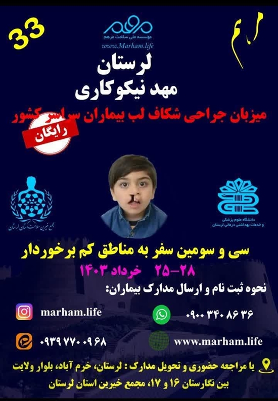 بنا به ابن گزارش، سی و سومین سفر موسسه ملی مرهم به استان لرستان در بازه زمانی ۲۵-۲۸ خردادماه پیش بینی شده است. جهت ثبت نام، ویزیت اولیه و نوبت دهی به پایگاه اینترنتی https://marham.life/ مراجعه کنند