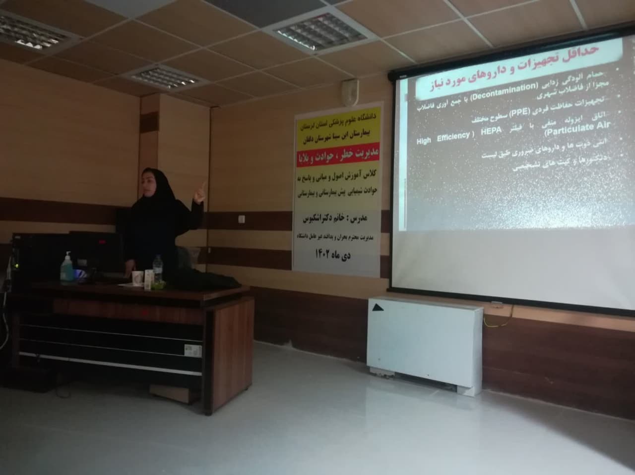 کارگاه آموزشی اصول و مبانی و پاسخ گویی به حوادث شیمیایی پیش بیمارستانی و بیمارستانی صبح امروز در سالن کنفرانس بیمارستان، توسط مدیر بحران و پدافند دانشگاه
